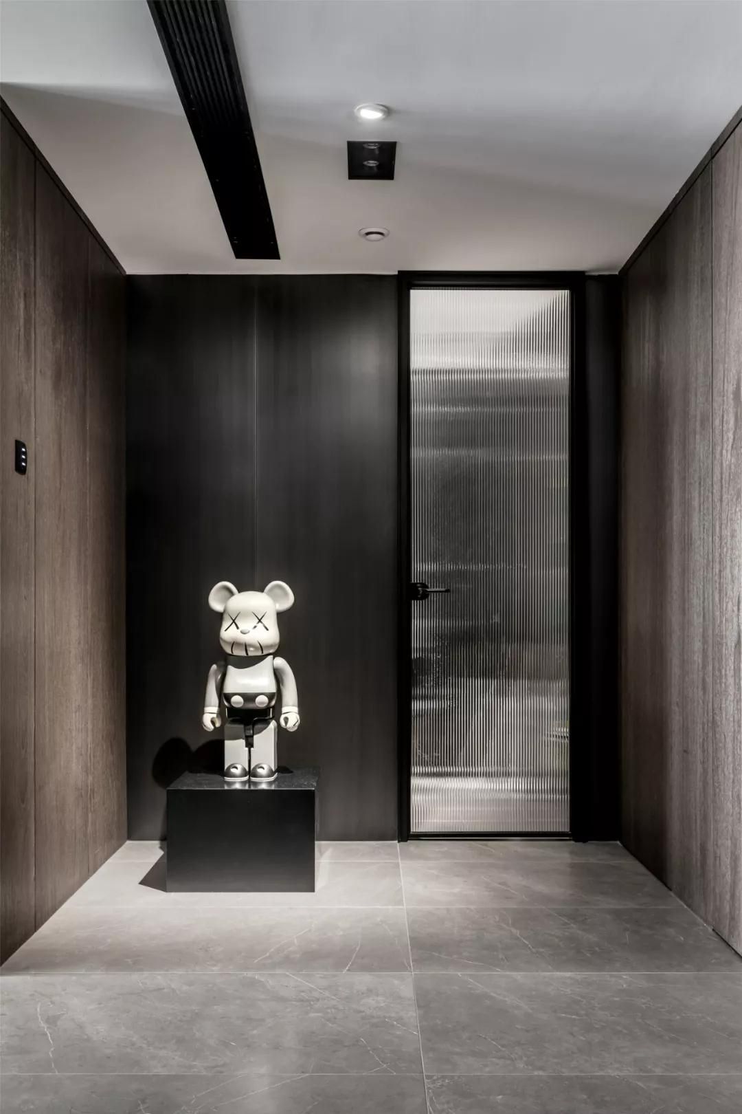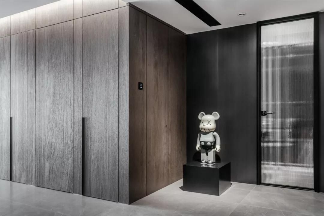 步入玄關(guān),映入眼簾的是一只超級限量版暴力熊,沒有繁雜的裝飾和色彩,純凈大方而又氣定神閑,黑色中透出霸氣與安全,讓人一進家門便忘卻了一天的煩擾與疲倦。