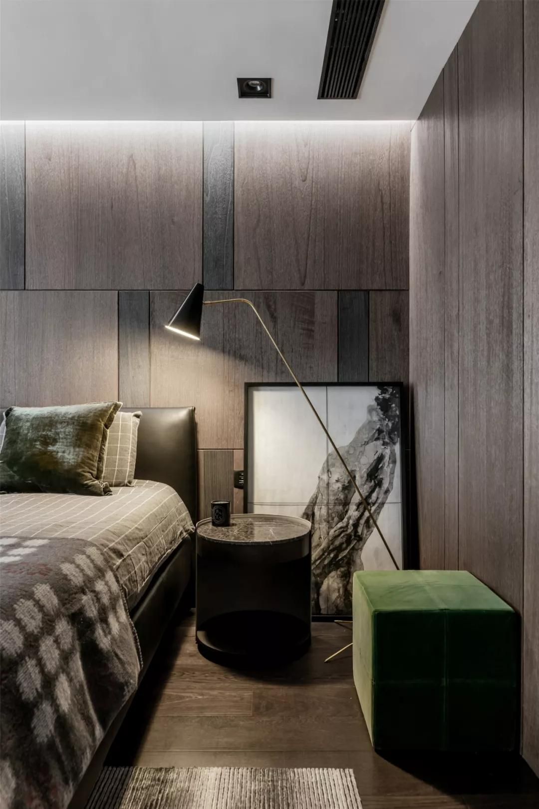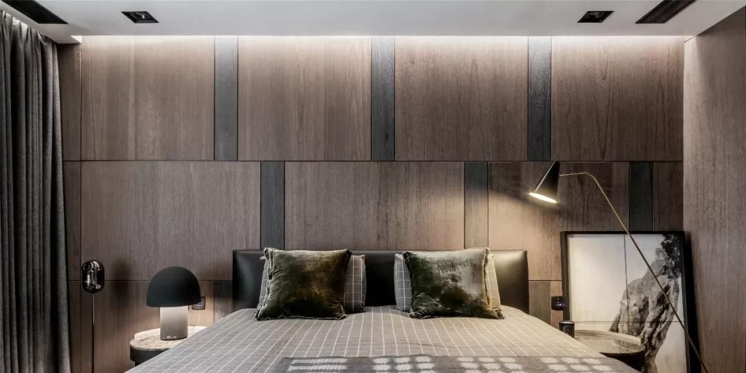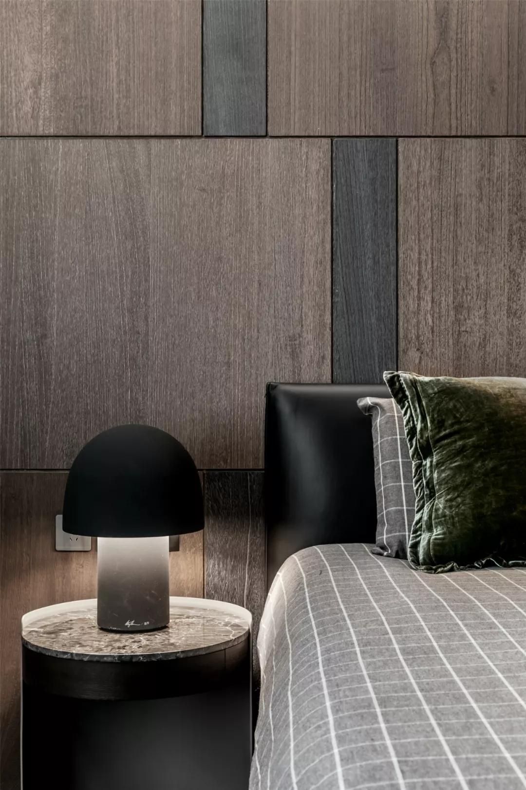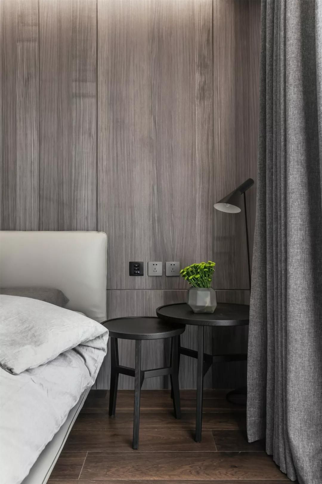灰色棉麻床品,簡單卻富有品質(zhì)感。床頭的裝飾畫在灰色空間和暖色燈光的映襯下,顯得尤為獨特,深色木地板低調(diào)而高雅。