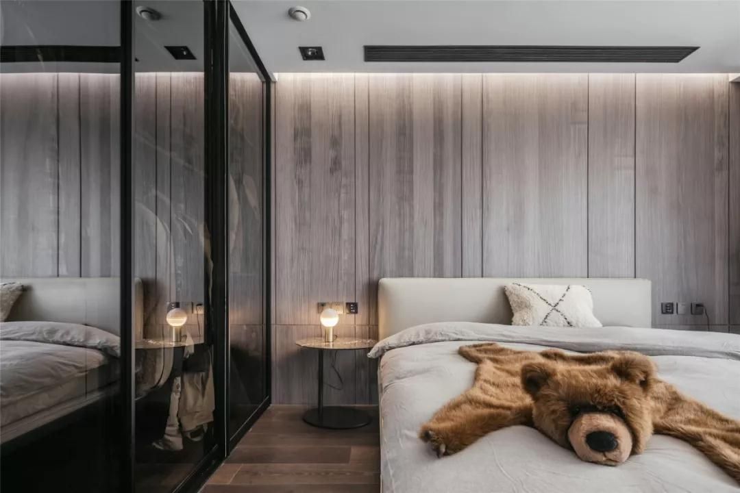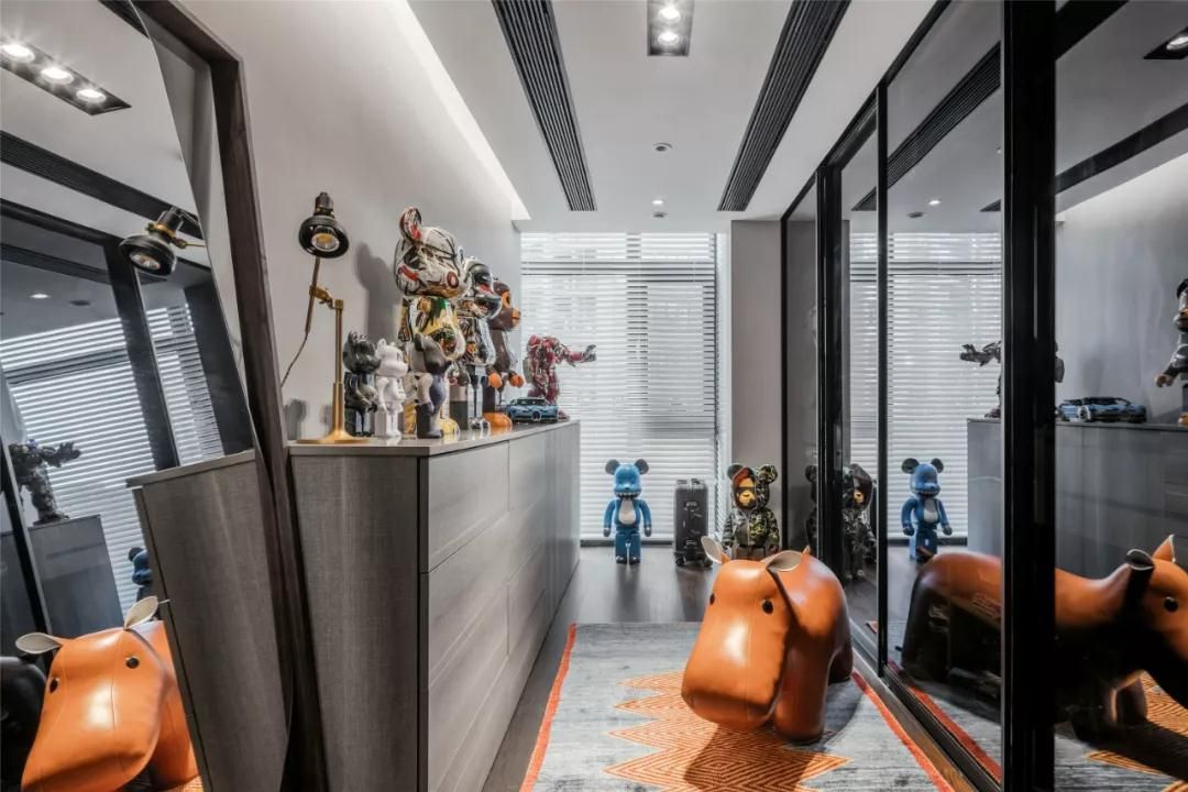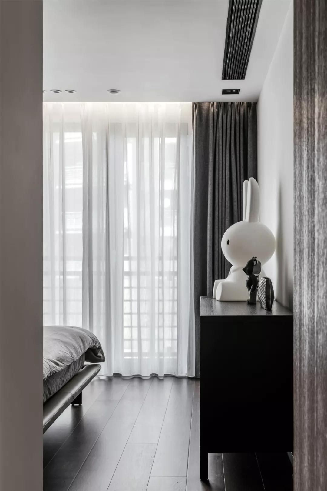 次臥延續(xù)黑白灰色系,為了中和高級灰?guī)淼睦淇岣校枚嘣馁|(zhì)與形態(tài)的卡通玩偶作裝飾擺件,令空間頗具幾分趣味。