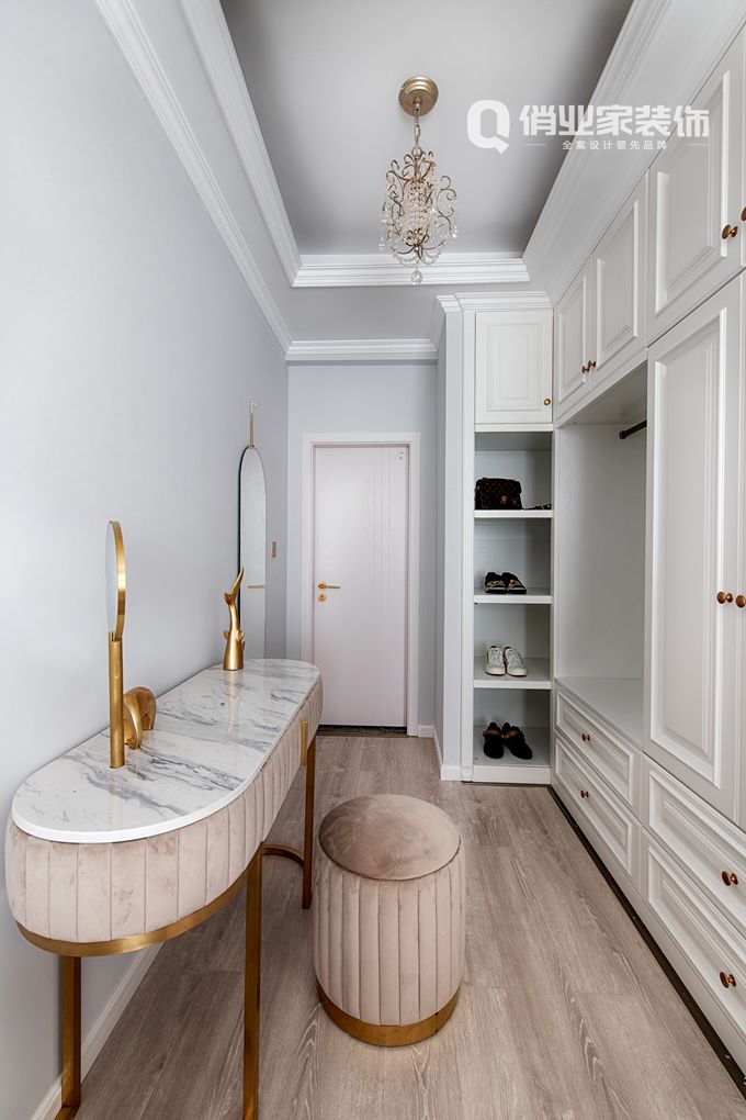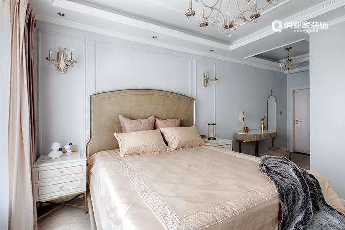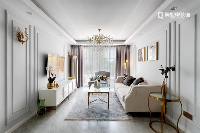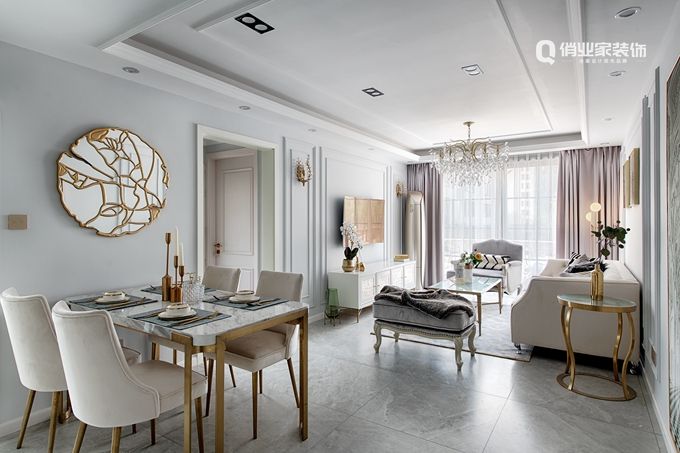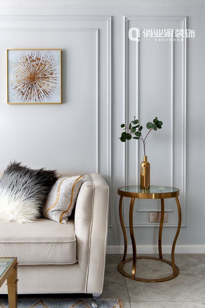 設(shè)計師吳萱考慮到現(xiàn)代居家簡約的生活方式,也為了保留那份輕松的姿態(tài)。所以,整屋墻面勾勒了整齊的石膏線條增加法式裝潢效果的層次感,白色和金色搭配則非常優(yōu)雅 ,結(jié)合藍(lán)灰淺色的墻面讓空間變得更加溫柔。