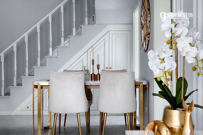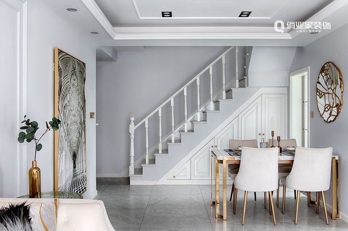 餐廳比鄰客廳,光線充足,不論身處餐廳還是客廳,都可以感受到愜意的生活氛圍。同時,為了保證空間的舒適度,并沒有設(shè)置酒柜或置物架,而是依靠樓梯下方有超大儲物功能,解決了戶型短板,也滿足了家庭實(shí)用性。