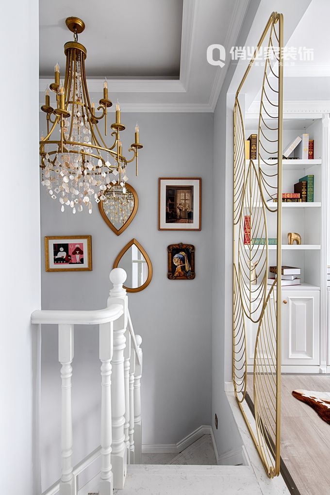 在樓梯這里,設(shè)計師花了更多的心思在軟裝上。樓梯墻面手繪掛畫,完全的手畫設(shè)計,經(jīng)過多次組合陳設(shè),最終確定陳設(shè)方案,才有了現(xiàn)在的效果。