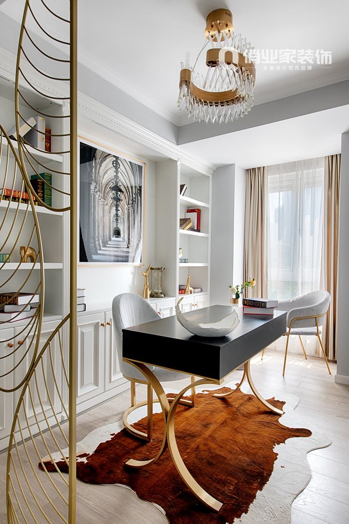 剛踏上二樓,就可見這個開放式的書房,不大卻十分精致。設(shè)計師吳萱原創(chuàng)設(shè)計的隔斷樣式,古銅色的金屬線條裝飾成嶄新的隔斷,獨(dú)一無二。開放的空間,精致的家具,時尚的獨(dú)椅。。。拿本書就可以從辦公狀態(tài)切換到閱讀時間,享受生活。