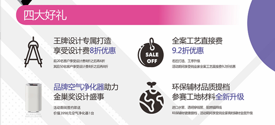 參與本次活動(dòng)前20名業(yè)主享受設(shè)計(jì)費(fèi)8折之后再6折,其后50名客戶享受設(shè)計(jì)費(fèi)8折之后再8折;全案工藝直接費(fèi)9.2折優(yōu)惠,名匠打造、工序升級;簽約即送價(jià)值3680元空氣凈化器1臺(tái);環(huán)保輔材品質(zhì)提檔,參賽工地材料全新升級進(jìn)口水管、透明穿線管、阻燃輻照線…環(huán)保輔材健康提檔,活動(dòng)期間享受俏業(yè)家高檔輔材全面免費(fèi)升級!